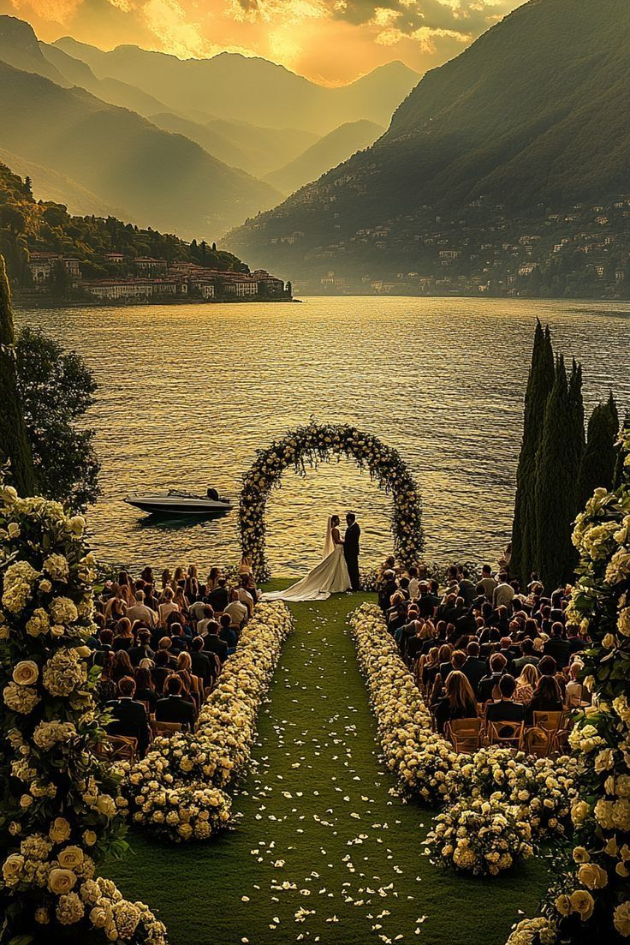 Exchange vows against a stunning sunset backdrop with the lake glistening behind you. The floral-lined aisle and natural beauty of the mountains and water create a magical and unforgettable moment.