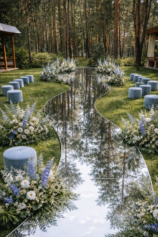 Step into a dreamy forest setting where nature meets elegance. A mirrored path lined with delicate flowers and soft seating creates a serene and romantic atmosphere for your special day.