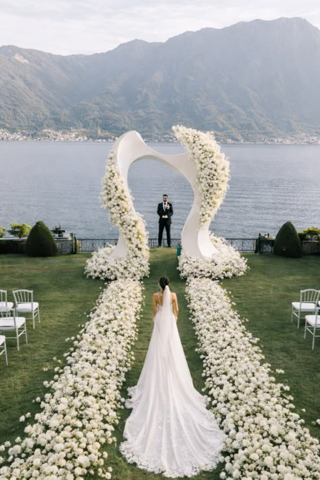 Walk down a breathtaking floral aisle toward your future, framed by an elegant modern arch and the stunning lake and mountain backdrop. This serene setting creates an unforgettable moment on your special day.