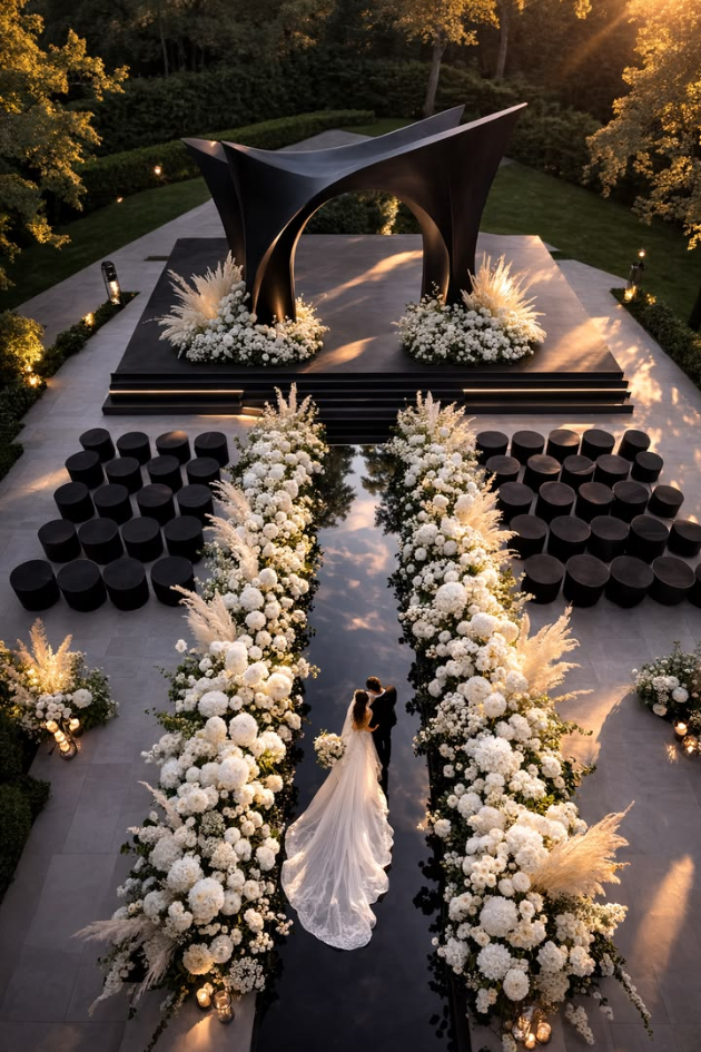 Walk down a stunning floral pathway framed by an avant-garde arch and bold black seating, creating a chic and contemporary atmosphere. This wedding setup blends modern design with timeless elegance for an unforgettable ceremony.
