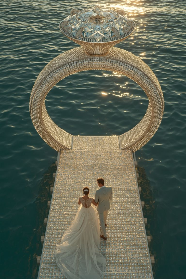 Walk down a breathtaking crystal-studded path towards your future, beneath a stunning diamond-shaped arch, with the tranquil waters reflecting the beauty of your love. This is a truly unforgettable wedding setting.
