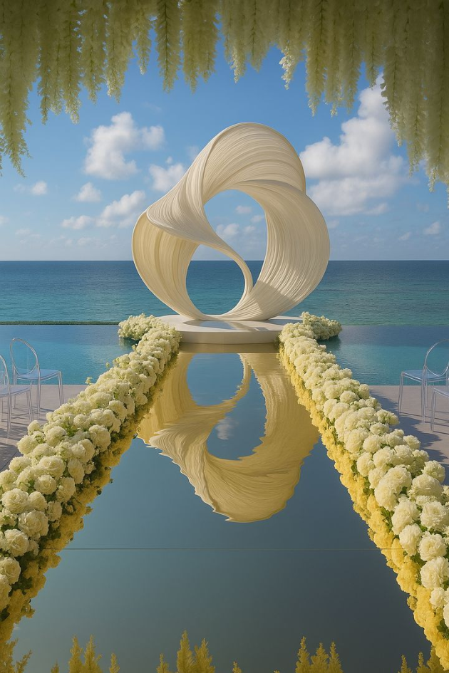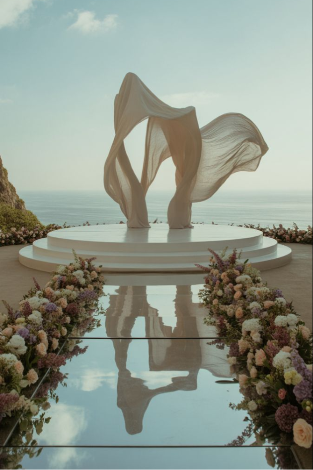 Step into a breathtaking ceremony framed by a flowing fabric sculpture, mirrored beneath your feet and surrounded by a vibrant floral pathway. With the ocean as your backdrop, this setting combines artistry and elegance for an unforgettable moment.