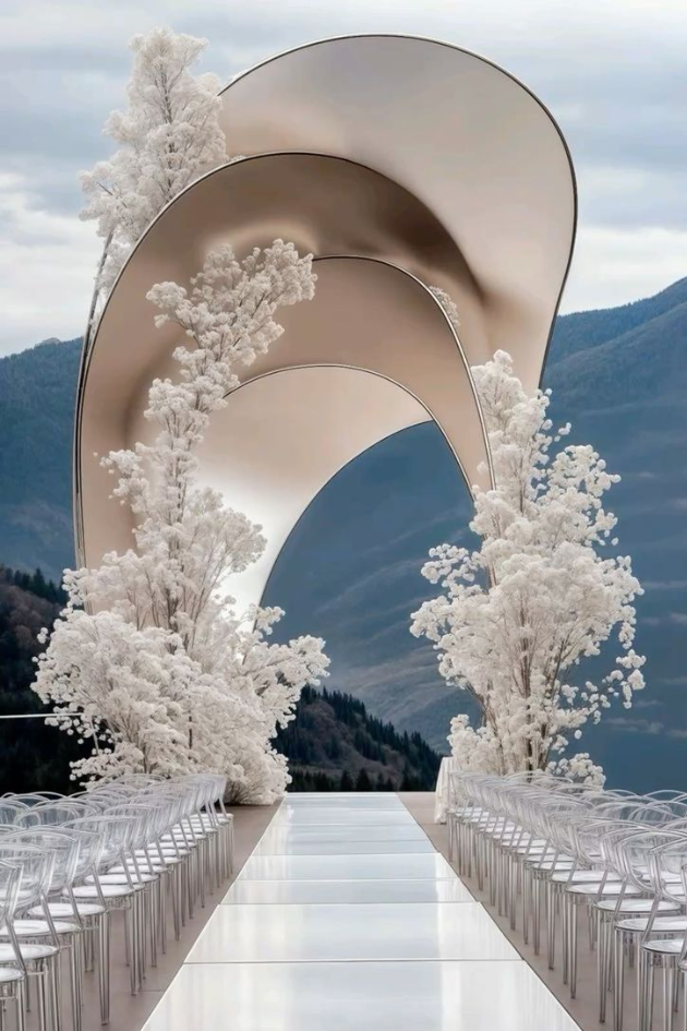 Walk down a sleek, mirrored aisle framed by stunning white floral arrangements and a contemporary sculptural arch, with majestic mountain views as your backdrop. This minimalist yet luxurious setting offers a timeless, artistic feel for your special day.
