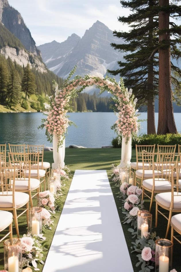 Walk down a serene white carpet bordered with soft pink roses and elegant candles, leading to a stunning floral arch. Surrounded by the majestic mountains and a peaceful lake, this setting offers a breathtakingly romantic wedding experience.