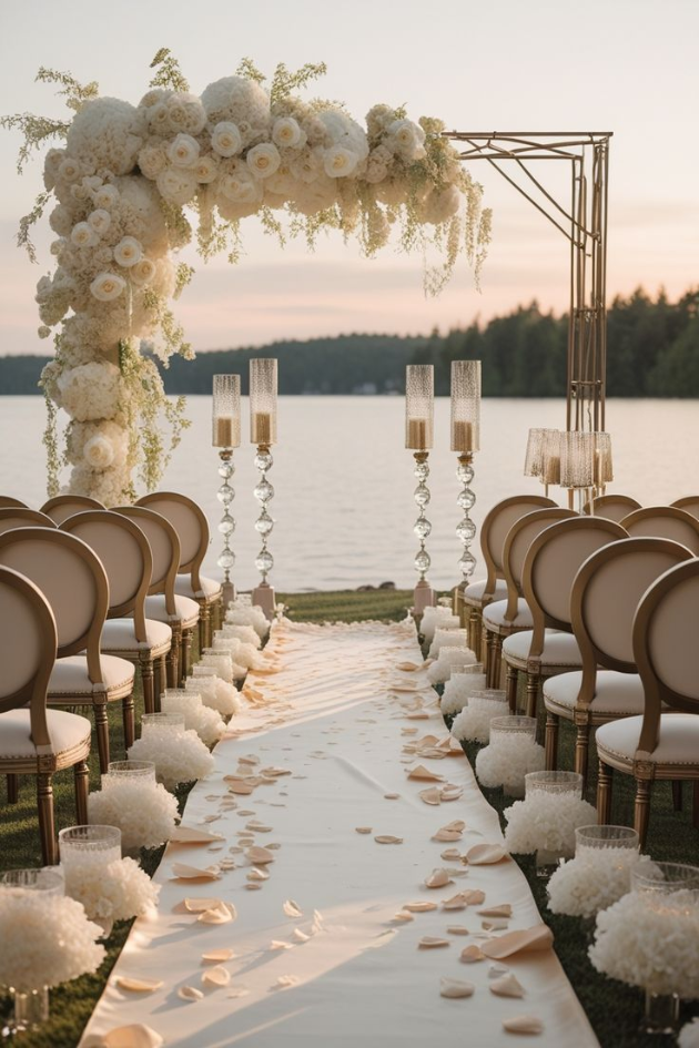 Walk down an ethereal aisle lined with white rose petals, delicate floral arrangements, and shimmering candles, leading to a breathtaking floral arch by the serene lake. This romantic setting offers a perfect blend of elegance and nature.