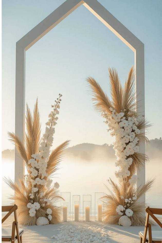 Step into a breathtaking beach ceremony with a minimalist white floral path, framed by a modern geometric arch and elegant pampas grass arrangements. The tranquil atmosphere of the lake and soft sunlight creates an unforgettable, romantic experience.