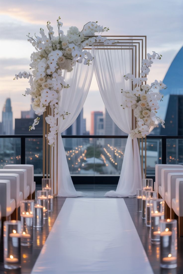 Step into a stylish rooftop wedding surrounded by modern cityscape views, framed by an elegant floral arch and candle-lit aisle. This sleek setting offers a perfect blend of luxury and romance for your unforgettable day.