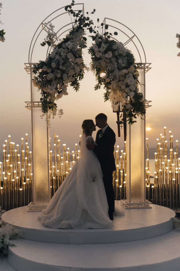 Exchange vows beneath a stunning floral arch as the sunset bathes the scene in golden light. Surrounded by elegant candlelight, this modern, intimate setting creates a magical atmosphere for your unforgettable wedding moment.