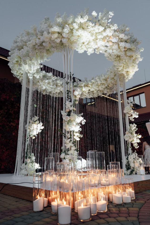 Exchange vows beneath a breathtaking suspended floral arch, illuminated by soft candlelight that dances on the floor. This enchanting setup blends beauty, elegance, and romance, creating an unforgettable wedding atmosphere.