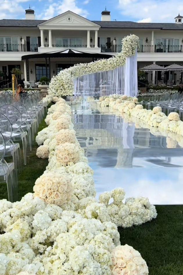 Walk down a stunning mirrored aisle, flanked by delicate white roses and hydrangeas, leading to a breathtaking floral canopy. The luxurious backdrop of a grand estate creates a perfect setting for your unforgettable ceremony.