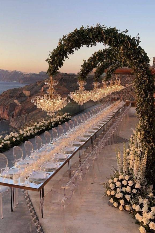 Dine in style on an exquisite long table, surrounded by lush greenery and sparkling chandeliers, with the breathtaking ocean view as your backdrop. This luxurious setting offers an unforgettable evening of romance and elegance.