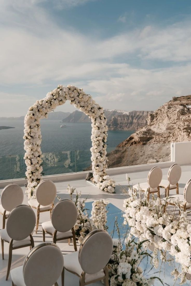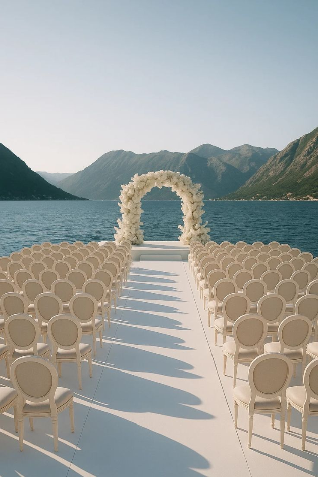 Walk down an immaculate white aisle, flanked by luxurious floral arrangements and framed by a stunning flower arch. With the beautiful sea and mountains as your backdrop, this breathtaking setting creates an unforgettable wedding experience.