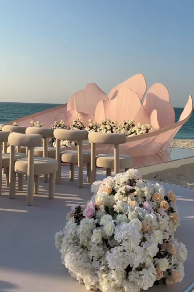 Celebrate your love beneath a stunning sculptural flower canopy, with a vibrant floral arrangement leading to your intimate ceremony. Set against the beautiful sea and sky, this unique design creates an unforgettable, chic atmosphere.