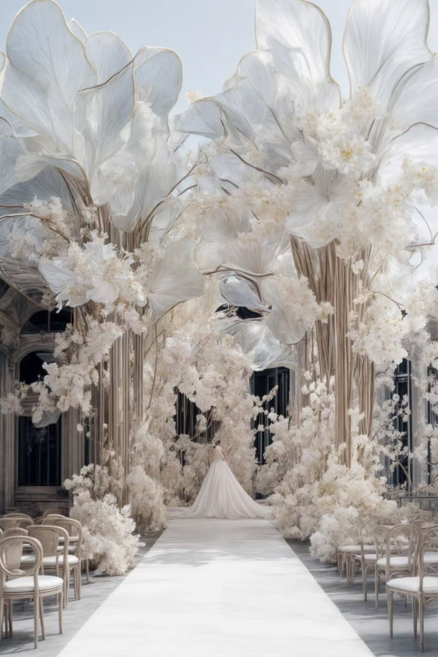 Step into a dreamlike setting, where towering ethereal flowers create a soft, magical atmosphere. With a flowing white aisle and delicate blooms, this setting embodies timeless elegance and serenity for your unforgettable day.