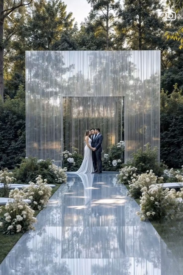 Step into a world of understated elegance with a sleek, reflective aisle leading to an ethereal, translucent floral arch. Surrounded by nature’s beauty, this setup combines modern design with timeless romance, offering the perfect backdrop for a stunning ceremony.
