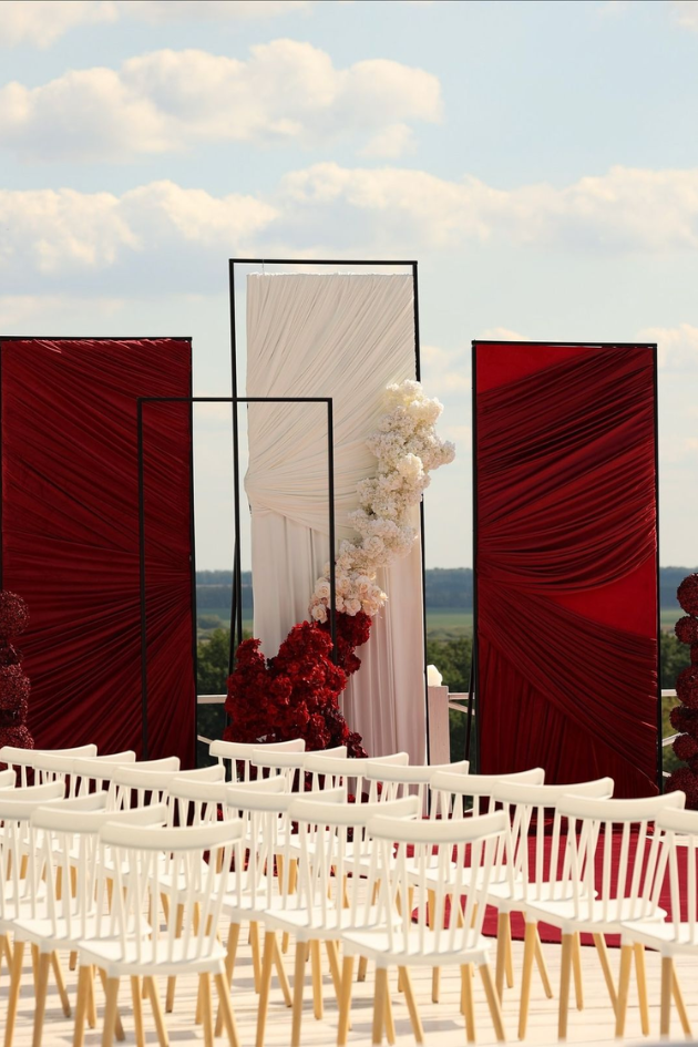 Transform your wedding into a sophisticated celebration with luxurious red and white drapery, complemented by vibrant floral arrangements. This design creates a romantic atmosphere, ideal for an elegant outdoor ceremony or reception.