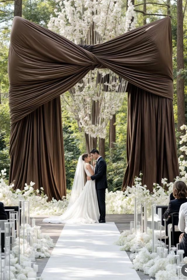 Create an enchanting wedding atmosphere with this dramatic brown drapery arch, surrounded by delicate white flowers. Perfect for a nature-inspired, sophisticated outdoor ceremony, this design combines elegance with a touch of modern flair.
