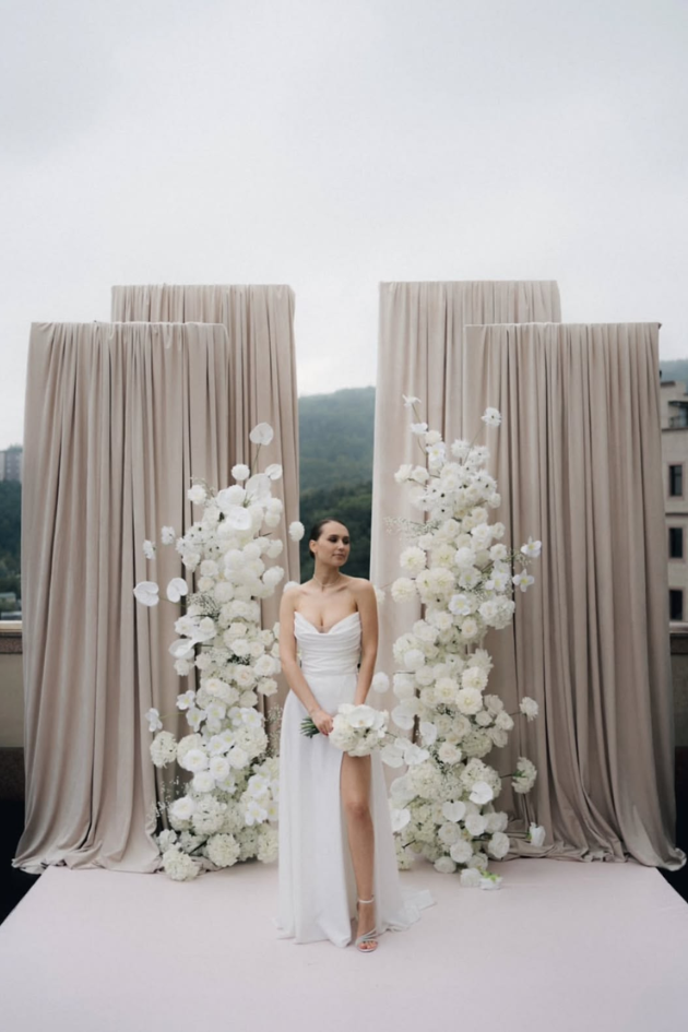 Create a serene and sophisticated vibe for your wedding with soft beige drapery and lush white flowers. This timeless design is perfect for an intimate, chic ceremony, combining simplicity and elegance for a breathtaking atmosphere.