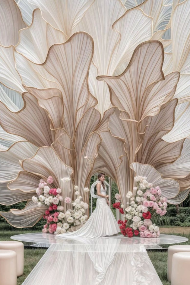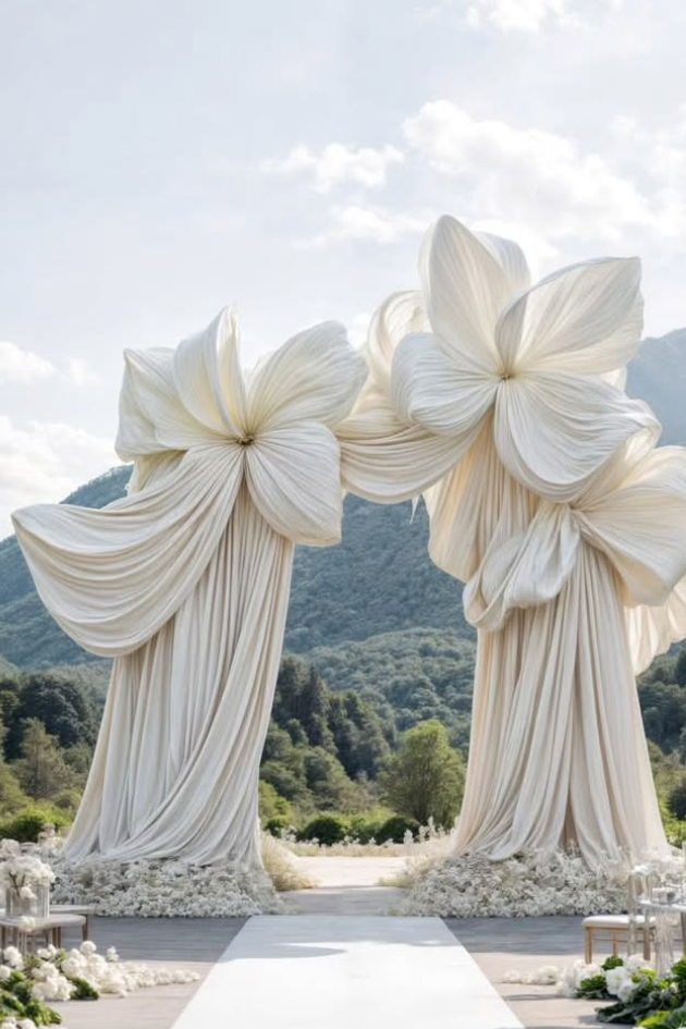 Elevate your wedding with a grand entrance featuring oversized white floral-inspired drapery. This stunning setup blends elegance and drama, perfect for a breathtaking outdoor ceremony surrounded by nature’s beauty.