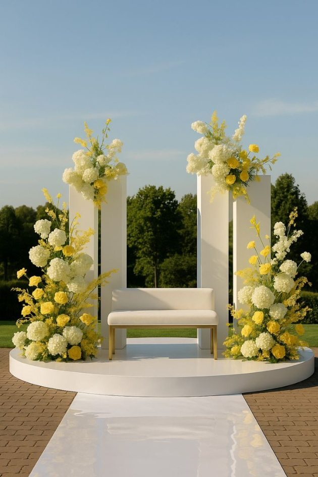 Add a pop of sunshine to your ceremony with this modern yellow floral arch. The clean white backdrop and vibrant yellow flowers create a fresh, joyful atmosphere, perfect for a spring or summer wedding.