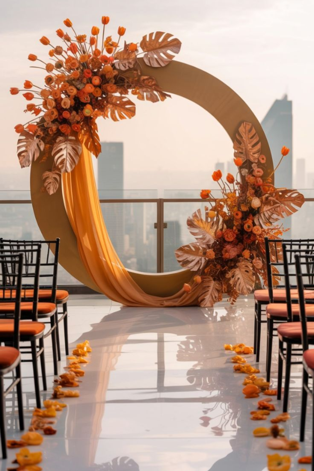 Brighten your celebration with a striking orange floral arch and flowing golden drapery. This modern design creates a bold, vibrant atmosphere, perfect for a contemporary, urban wedding.