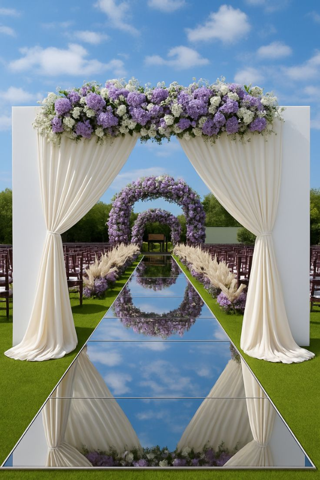 Create a fairytale wedding experience with a stunning purple floral arch and mirrored aisle. This enchanting design reflects the beauty of nature, perfect for a romantic, outdoor ceremony under the open sky.