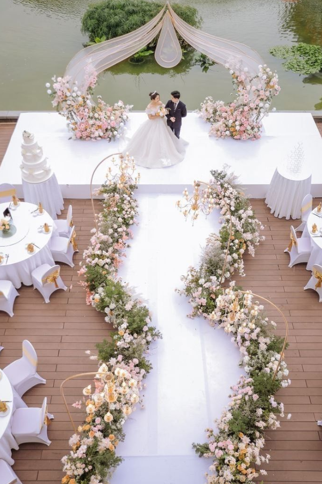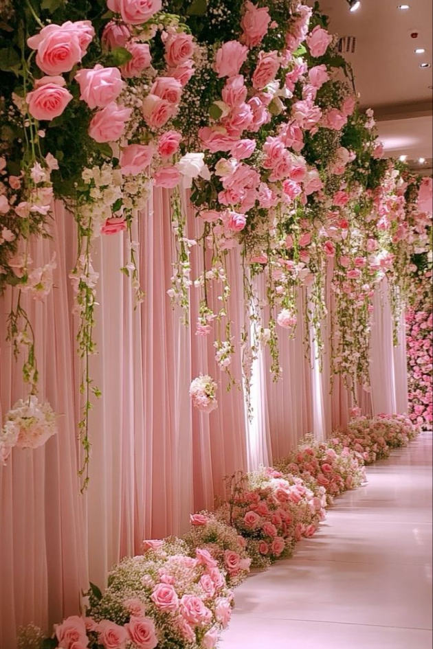 Create a dreamy, romantic atmosphere with cascading pink roses and delicate baby’s breath lining your aisle. This elegant floral display adds a touch of softness and beauty, perfect for a classic, intimate wedding.