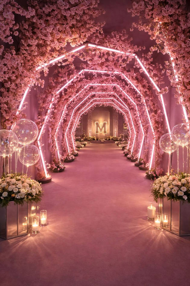 10. Glowing Pink Cherry Blossom Wedding Aisle with Neon Lights
