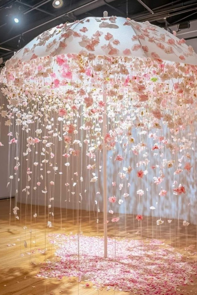 Add a whimsical touch to your ceremony with a floating floral umbrella, dripping with delicate pink blossoms. This romantic and ethereal design creates a dreamlike atmosphere, perfect for an enchanting wedding.