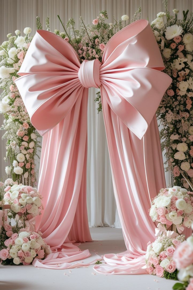 12. Elegant Pink Satin Bow Wedding Arch with Floral Accents