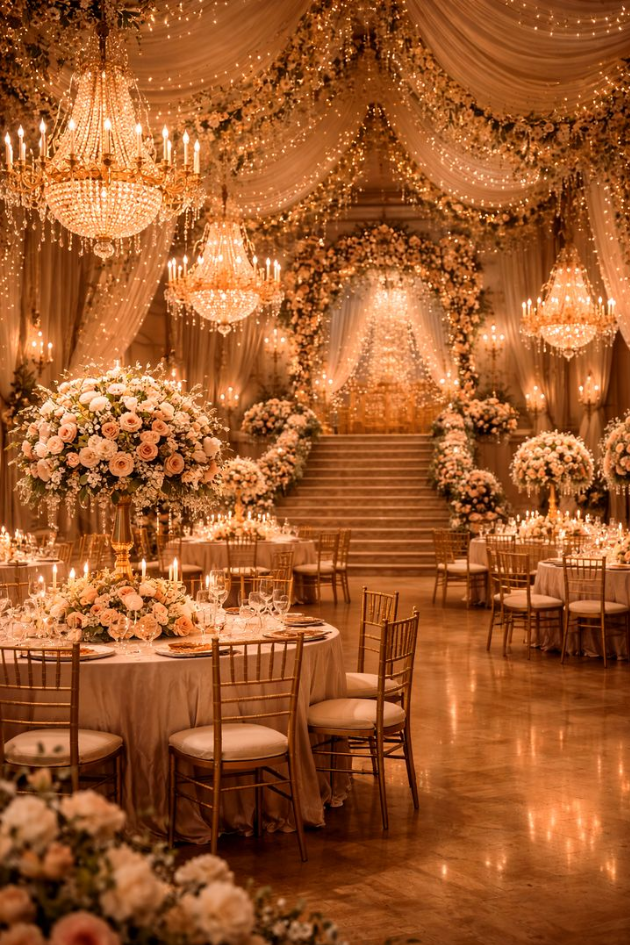 Transform your wedding reception into a fairy-tale setting with luxurious chandeliers, cascading flowers, and soft lighting. This grand design creates a romantic, timeless atmosphere perfect for an unforgettable celebration.