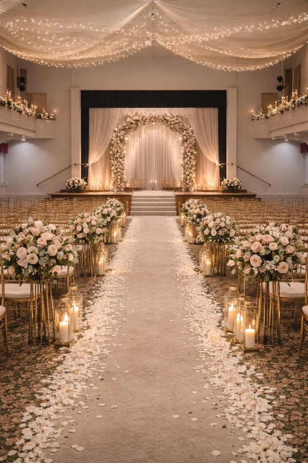 Create a magical atmosphere with this stunning floral-lined aisle, glowing candles, and twinkling fairy lights. The romantic setup, complemented by soft rose petals, makes for an unforgettable wedding ceremony.