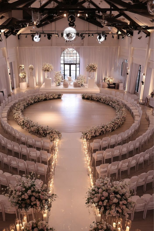Create a modern, intimate atmosphere with a circular wedding setup, surrounded by soft floral arrangements and glowing candles. This minimalist yet luxurious design will give your ceremony a chic, elegant feel.