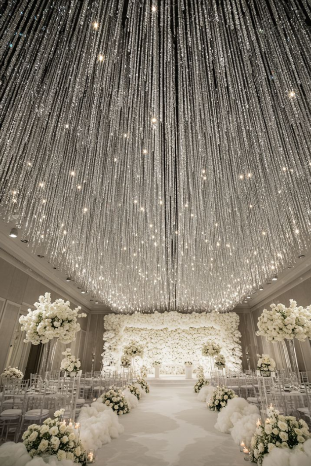 16. Enchanting Wedding Ceremony with Crystal-Cascading Ceiling and White Florals