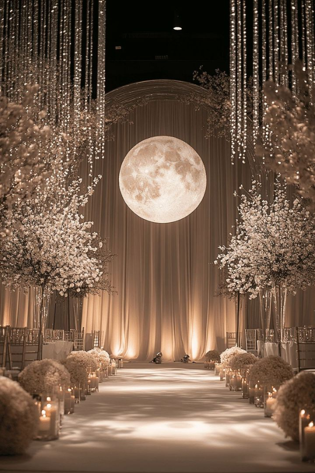 Create an enchanting atmosphere with a glowing moon backdrop, surrounded by delicate cherry blossoms and shimmering crystal lights. This ethereal setup, combined with soft candlelight, adds a romantic, celestial touch to your wedding day.
