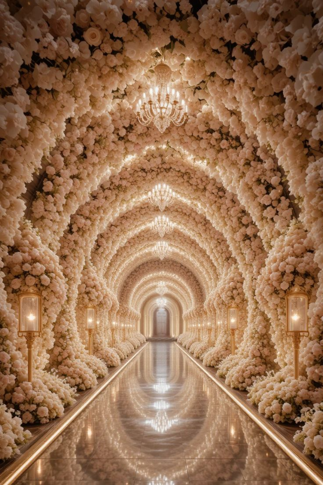Create a luxurious and timeless wedding atmosphere with this grand floral tunnel, lined with cascading white blooms and sparkling crystal chandeliers. The soft lighting and elegant path will lead you to an unforgettable ceremony.