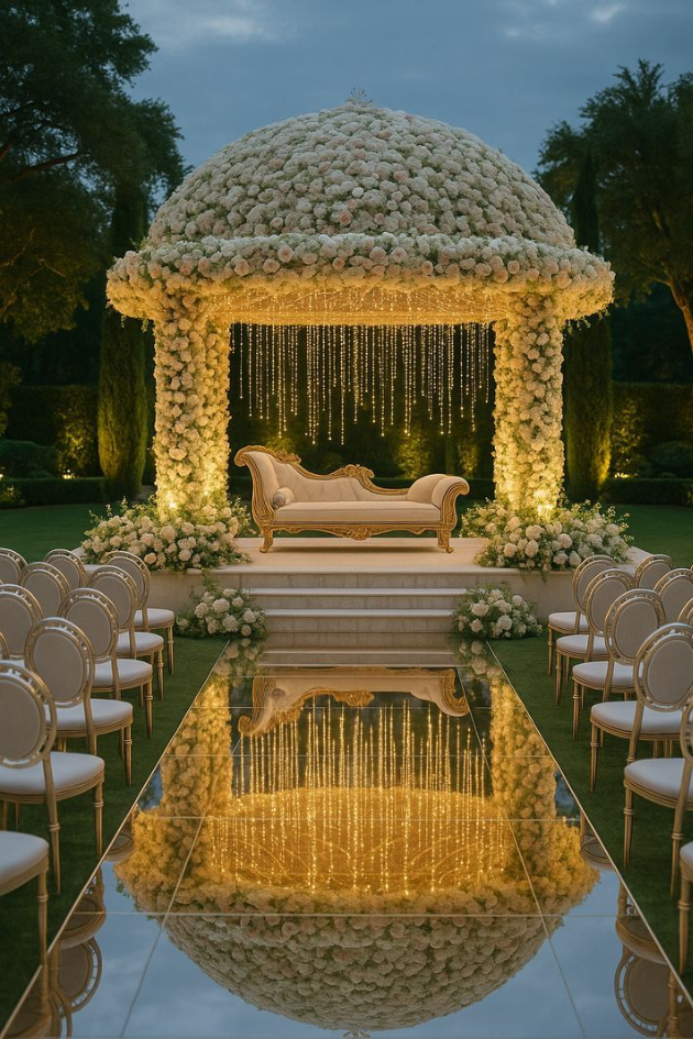 Create an enchanting outdoor ceremony with a lavish floral-covered gazebo, sparkling golden lights, and a mirrored aisle. This stunning setup is perfect for a romantic and luxurious wedding under the stars.
