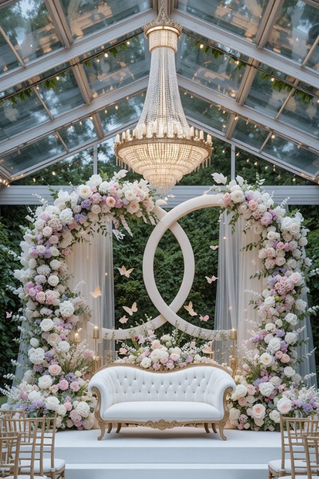 20. Elegant Wedding Ceremony with Crystal Chandelier and Floral Arches