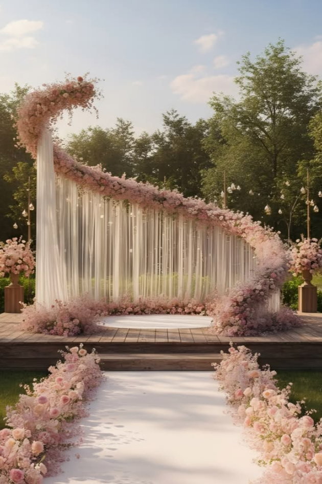 Embrace a dreamy garden wedding with this whimsical floral arch, draped in soft fabric and surrounded by pink blooms. This enchanting setup, paired with delicate flower-lined pathways, creates an unforgettable romantic atmosphere.