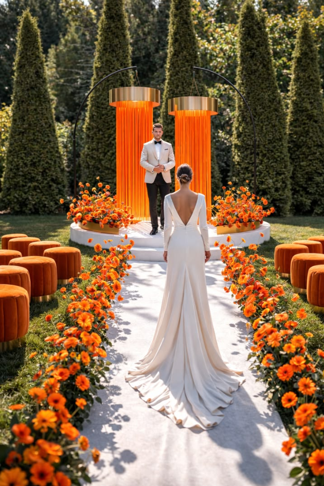 Make a bold statement with this striking orange and gold wedding arch, paired with a vibrant floral pathway and contemporary seating. This colorful, modern design creates an energetic, lively atmosphere perfect for a unique outdoor ceremony.