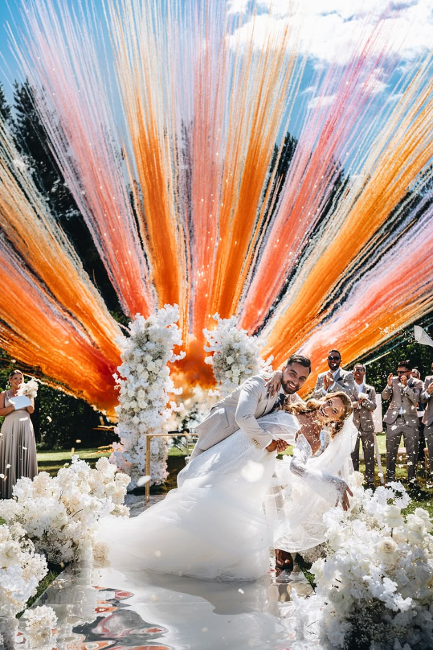 Celebrate in style with this bold and vibrant wedding ceremony featuring a burst of colorful powder and elegant floral arrangements. This lively design, complete with dramatic flair and festive energy, will make your special day unforgettable.