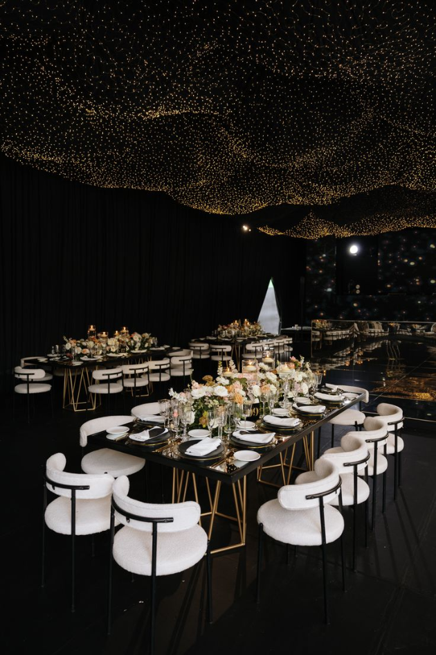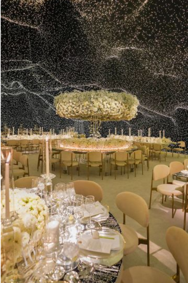 Immerse yourself in a stunning wedding atmosphere with a starry night ceiling, twinkling lights, and elegant tablescapes. The luxurious decor and soft, romantic ambiance create an unforgettable celebration setting.