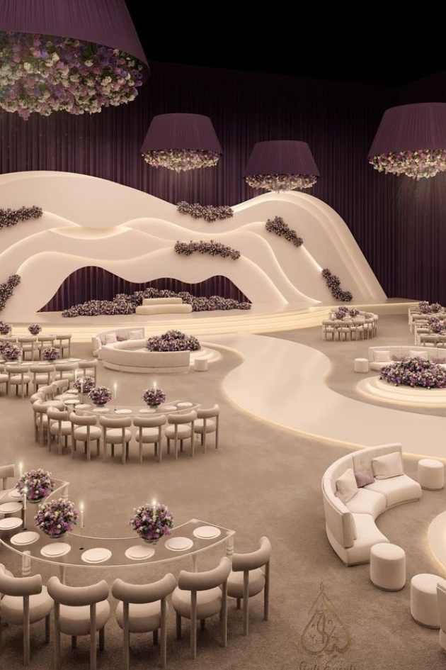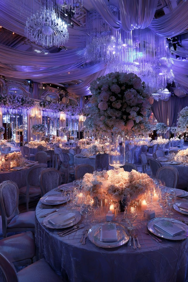 Create an unforgettable wedding reception with cascading crystal chandeliers, luxurious purple lighting, and elegant floral centerpieces. This opulent setting exudes romance and sophistication, perfect for a glamorous celebration.