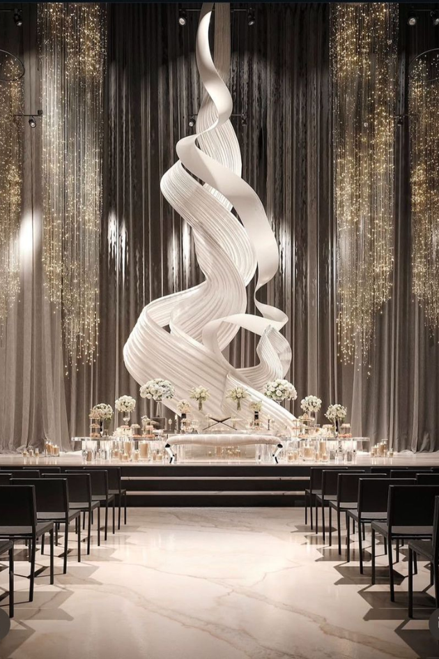 Create a modern and sophisticated atmosphere with a stunning sculptural centerpiece, surrounded by shimmering lights and elegant floral arrangements. This artistic and luxurious design will make your wedding ceremony unforgettable.