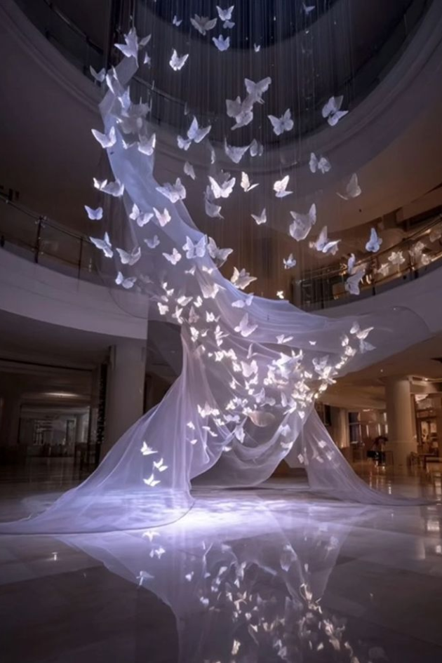 Create an enchanting, dreamlike wedding atmosphere with a delicate display of floating butterflies and flowing drapery, illuminated softly from below. This ethereal setup adds a touch of magic and elegance to your special day.