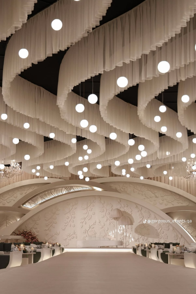 Transform your wedding space into an artful, modern haven with flowing drapes and soft, floating lights. This chic design adds sophistication, creating a dreamy atmosphere for your special day.
